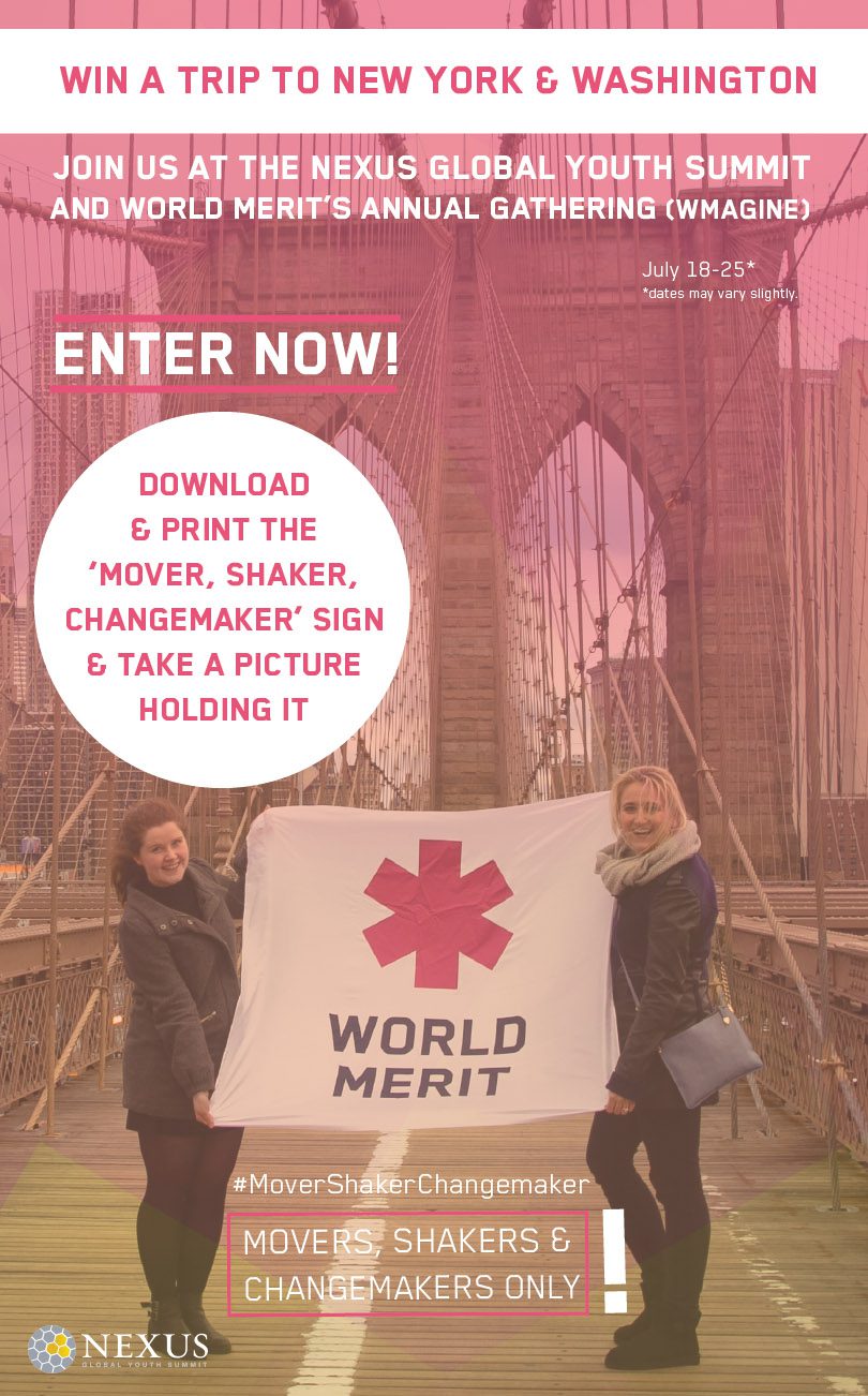Enter Now for the World Merit photo contest to win a fully funded trip to an incredible youth summit in New York and Washington DC. The 10 people with the most votes will be interviewed by the end of May to measure their ‘Mover, Shaker, Changemaker’ mindset.
