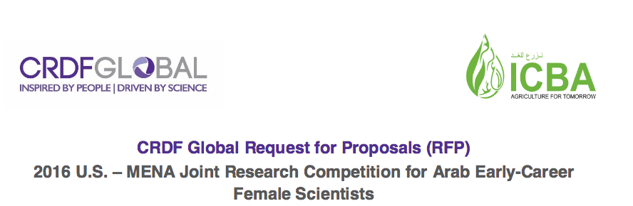CRDF Global is accepting proposals to support collaborate research projects between young Arab female investigators in the Middle East and North Africa region (MENA) and U.S. researchers in the agricultural sciences for the 2016 U.S.-MENA Joint Research Initiative. This initiative is jointly funded by CRDF Global and the International Center for Biosaline Agriculture (ICBA).