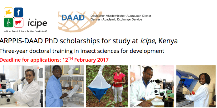 The International Centre of Insect Physiology and Ecology (icipe), Kenya, in partnership with the German Academic Exchange Service (DAAD1) In-Country/In-Region Scholarships Programme and African university partners, invites applications from suitably qualified candidates for PhD scholarships in the African Regional Postgraduate Programme in Insect Sciences (ARPPIS).