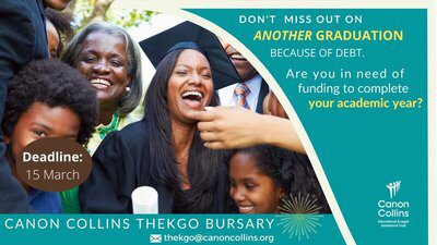 In 2019, in response to the new funding of Higher Education by the South African government, the Canon Collins Thekgo Bursary has been restructured from providing registration fee for first year students to providing bursaries that alleviate undergraduate students’ debt. Students who have completed their undergraduate/Honours studies, but their degree certificates/academic records have been withheld due to outstanding debt owed to the university, can apply for debt relief of up to R6,000 in the following disciplines: