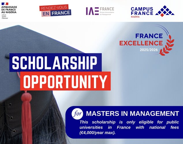 Applications are now open for the 2025/2026 Embassy of France in Nigeria Masters in Management Scholarship Program. This program is funded by the French Ministry for Europe and Foreign Affairs, in collaboration with the French Ministry for Higher Education and Research, and implemented by the French Embassy and Campus France Nigeria.