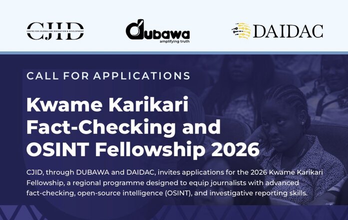 Applications are now open for the 2026 Kwame Karikari Fact-checking and OSINT Fellowship. The fellowship is presented by DUBAWA and the Digital Technology, Artificial Intelligence, and Information Disorder Analysis Centre (DAIDAC), Africa’s leading in-depth research, information verification and fact-checking platforms.