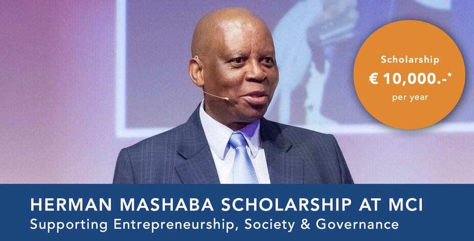 Applications are now open for the 2026 MCI-Herman Mashaba Scholarship. Promoting Entrepreneurship, Society and Good Governance is a joint mission of the South African Entrepreneur and Statesman Herman Mashaba and MCI | The Entrepreneurial School® in Innsbruck, Austria.