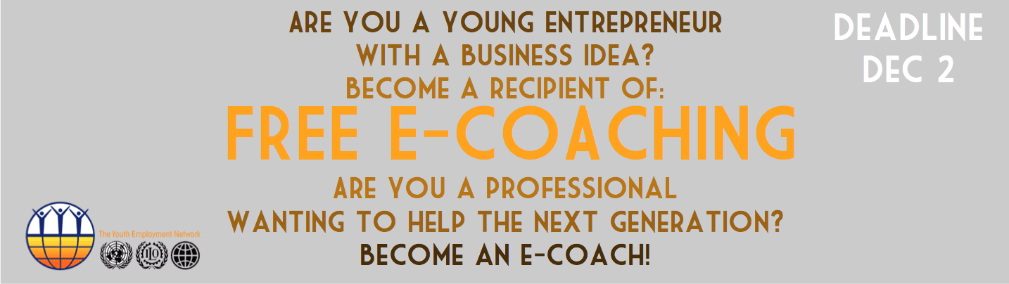 “The Youth Employment Network (YEN), an inter-agency programme of the UN, the ILO and the World Bank, offers a free E-Coaching programme for young entrepreneurs (16-35) who have recently started or are in the process of starting a business. Trained E-Coaches provide guidance (in Spanish, English, or French) to young entrepreneurs over a period of 3 to 12 months.