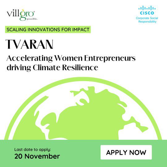 TVARAN is a market access program by Villgro and an initiative by Cisco Corporate Social Responsibility. The program intends to support the growth and expansion of Women-led social enterprises in Climate Action. Applicants will be invited to share their Go-To-Market plans, basis which 5 women entrepreneurs will be selected for market connects, pilot/trial facilitation, technical assistance and mentorship jointly by Villgro and Cisco Corporate Social Responsibility. The 6-month acceleration phase will begin in February 2023 and will accelerate the market presence of innovations in renewable energy, water & waste management, and climate-smart agriculture, amongst others.